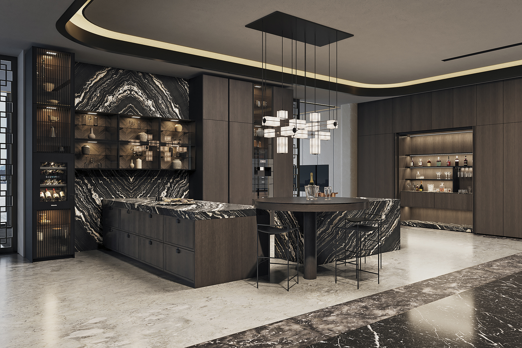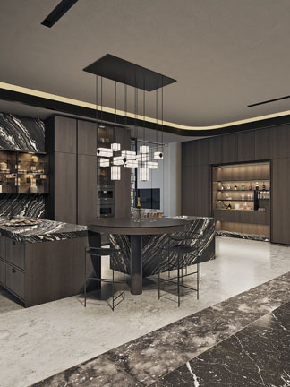 MONDIAL is characterized by an array of intriguing geometric forms, such as a semi-circular bar, round table, and cube-shaped glass-front cabinets. Varying cabinet elevations, rich wood tones, and elegant natural stone finishes also help to create visual textures for the simplistic yet sensual design. The result is a kitchen that effortlessly flows into its surroundings, blurring the lines between work and living spaces.