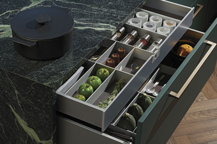 Designers and homeowners alike can customize MONDIAL to express their individuality through a vibrant palette of bold colors and luxurious materials. Natural stone countertop options range from limestone and granite to exquisite marble, quartzite, and the exotic green-hued gemstone, Serpentinite. The natural stones can be paired with a variety of woods, such as Travertine Oak, Nutmeg Oak, and Dark Walnut, ensuring each kitchen is a true reflection of personal style. Inside the sleek cabinets, customizable drawer interiors cater to optimal organization and storage, merging beauty with practicality.